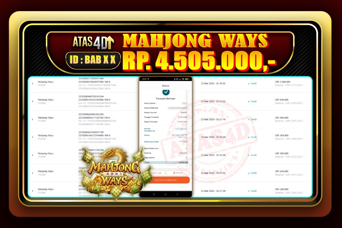 Daya tarik ATAS4D yang menawan telah memikat hati banyak pemain di Indonesia. Platform ini menawarkan pengalaman bermain yang lengkap dengan pilihan pasaran togel terlengkap dan berbagai permainan slot seru yang menghadirkan sensasi tiada duanya. Setiap pemain berkesempatan menikmati momen seru yang memacu adrenalin serta peluang meraih kemenangan yang memuaskan. Dengan antarmuka yang user-friendly dan tampilan yang modern, ATAS 4D membuat sesi bermain semakin menyenangkan dan mudah diakses kapan saja, di mana saja. Tak hanya menyuguhkan permainan menarik, ATAS4D juga memanjakan pemain dengan beragam bonus dan promosi istimewa yang sulit ditemukan di tempat lain. Mulai dari bonus pendaftaran untuk member baru, bonus deposit harian, hingga event dan turnamen spesial yang diadakan secara terus menerus. Semua ini dirancang untuk memberikan keuntungan maksimal bagi para pemain, sekaligus menambah keseruan di setiap permainan. Setiap bonus dan promosi yang ditawarkan membantu meningkatkan peluang kemenangan sehingga para pemain semakin betah dan tertantang untuk terus bermain.Siapakah yang Akan Menjadi Pemenang Selanjutnya?